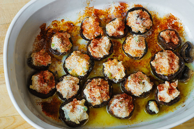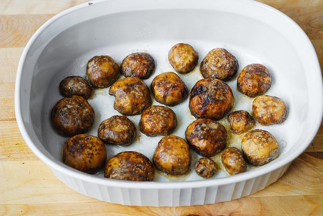 First, you start by pre-baking the mushrooms in the oven to help them lose some of the moisture. Dip each mushroom cap in butter and place mushrooms caps side up in a medium baking dish. Bake for 10-15 minutes at 400 F
