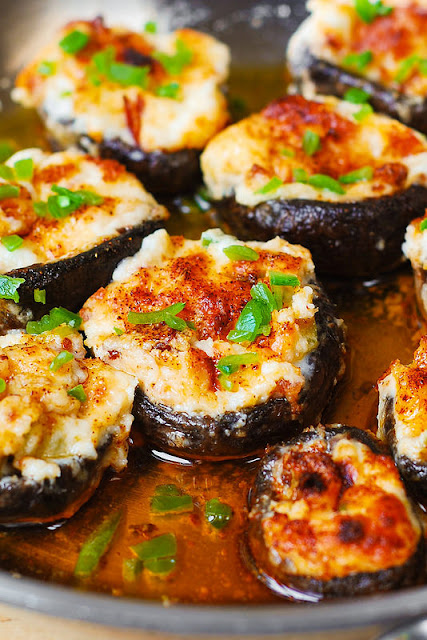 Bacon and Cheese Stuffed Mushrooms – delicious, homemade bite-sized mini-appetizers loved by adults and kids alike! The stuffing is made with Parmesan and Mozzarella cheeses, cream cheese, bacon bits, finely chopped green bell pepper, with a touch of Cayenne pepper. Baked in a small amount of butter, with a splash of lemon juice.