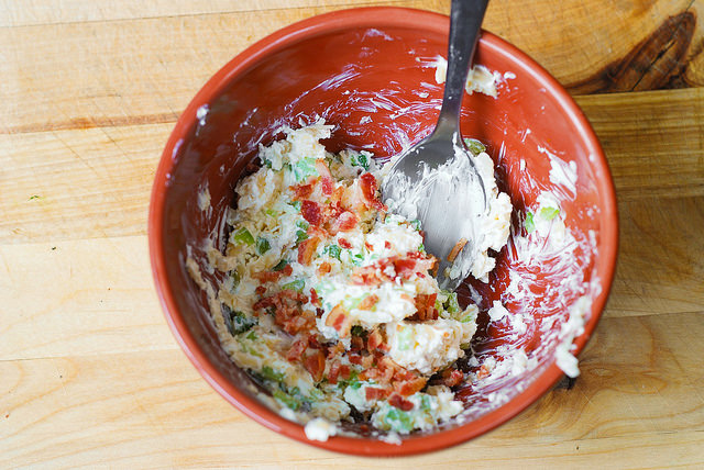 Make the stuffing by mixing softened cream cheese, Parmesan cheese, Mozzarella cheese, bacon bits, finely chopped bell pepper, and a splash of cayenne pepper, season with salt if necessary: