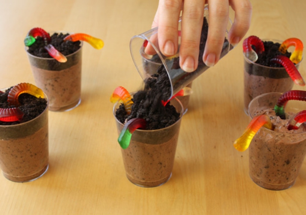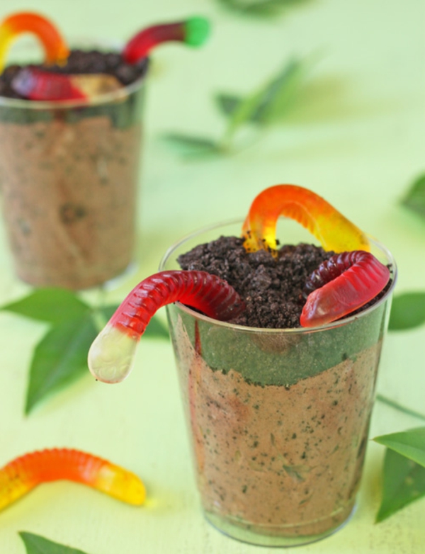 “Worms in Dirt” may not sound appetizing, but the taste of this easy dessert will make you a believer! These chocolate pudding cups are decorated with crushed cookies and gummy worms, to make a creepy-crawly treat that kids will love to help make and eat.