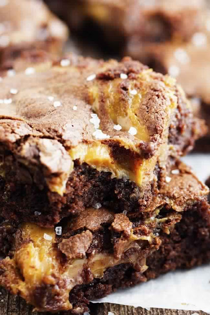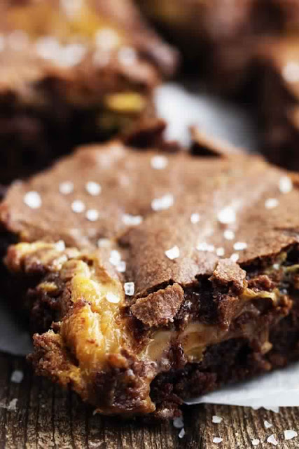 5/Pour the melted caramel over the warm brownie layer. Sprinkle coarse sea salt on top. Drop remaining brownie batter over the top of the caramel and carefully swirl the top with a knife. Bake for an additional 35-40 minutes or until toothpick inserted in center comes out clean. Do not overbake. Allow the brownies to completely cool before serving. Can also garnish the brownies lightly with additional sea salt.