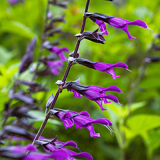 Hummingbird favorite Salvia‘Amistad’ grows fast to 4 feet tall with little water.